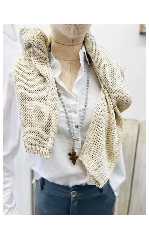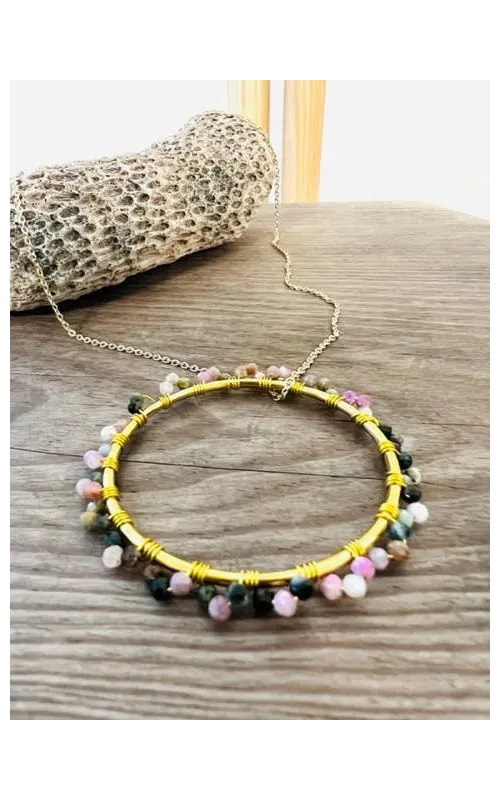 Gargantilla de cuentas mini en piedra natural, con adorno de moneda en acero dorado.